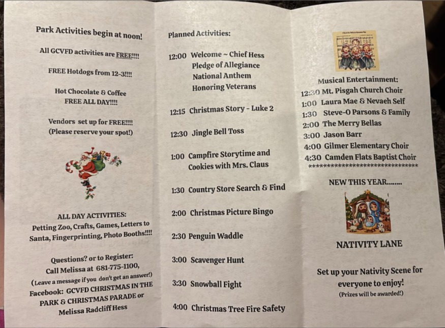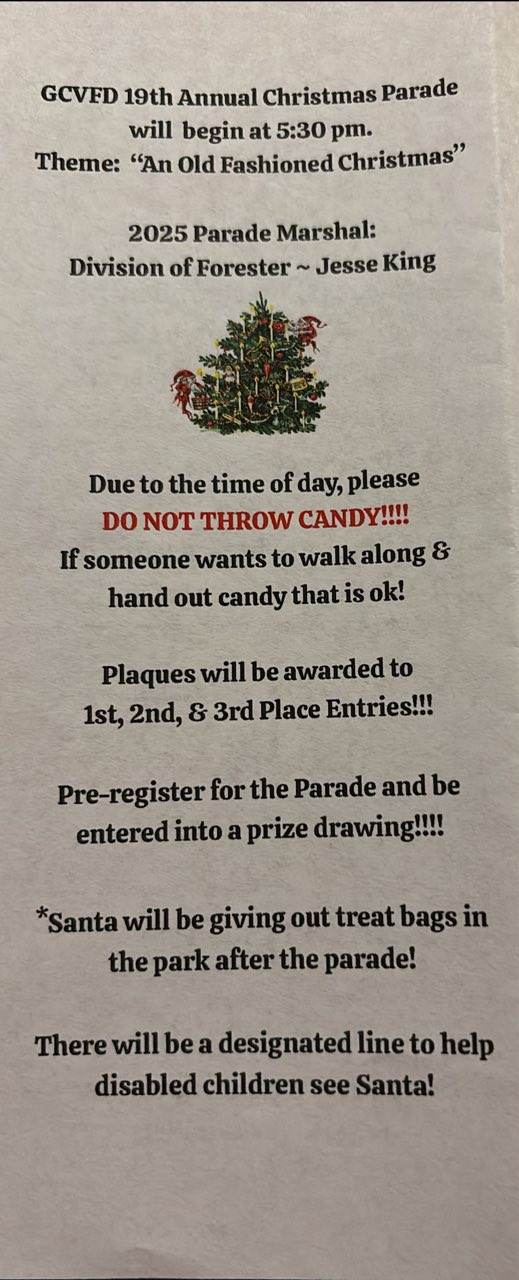 Posted on December 3, 2025, Edited December 3, 2025 by clerk December 13, 2025 GCVFD Christmas In The Park & Christmas Parade Christmas In The Park events start at noon – Christmas Parade starts at 5:00pm